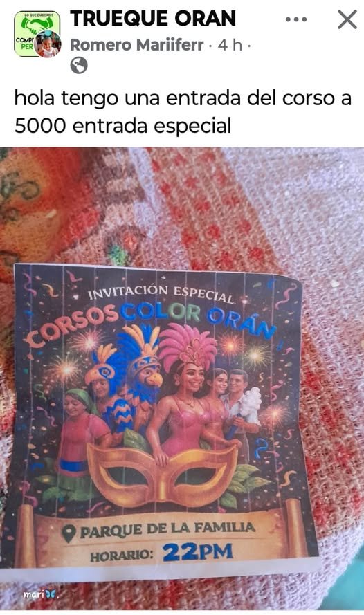 El siguiente es un comunicado emitido por la Comisión de Corso Color Orán 2026 relacionado con la publicación que apareció en la red social Facebook donde se ofrecía la venta de una entrada para la noche de este sábado 24 de enero a un valor de $ 5.000.