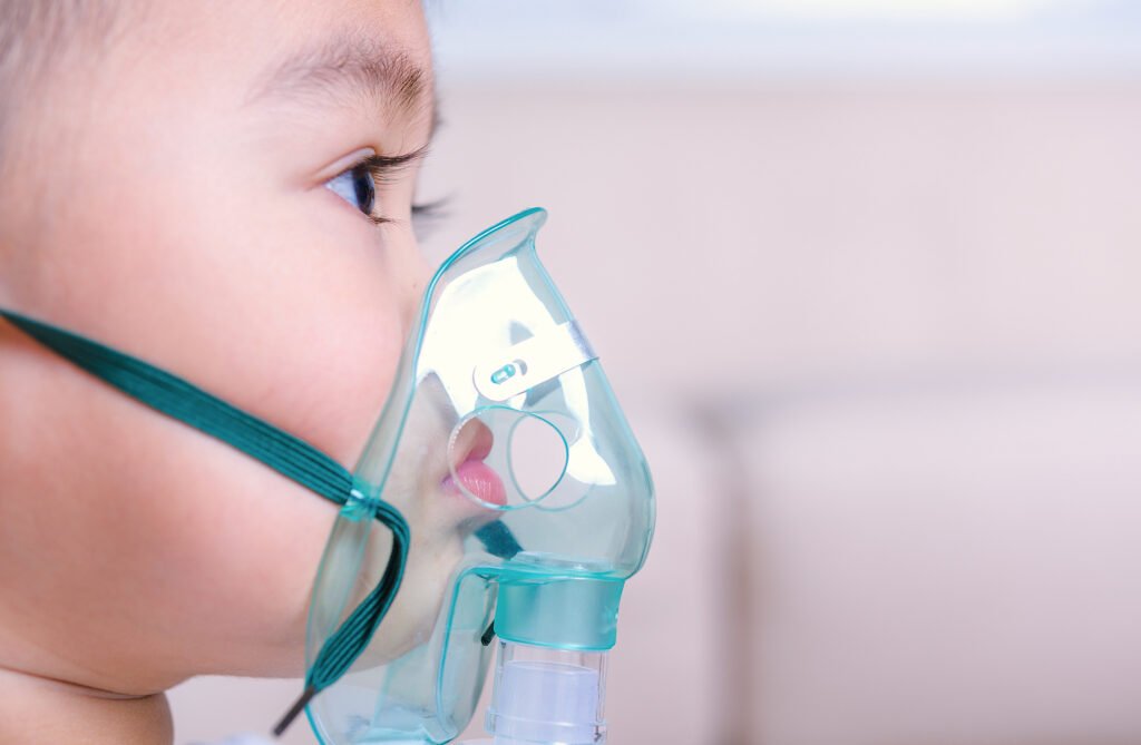 Closeup asian face little children boy sick he using steam inhaler nebulizer mask inhalation oneself, health medical care