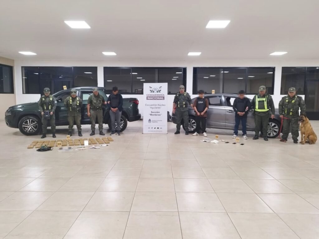 Al controlar un primer vehículo, que oficiaba como “puntero”, los uniformados notaron que los ocupantes (padre e hijo) respondían nerviosos a las preguntas básicas de rutina. Minutos más tarde, sobre el dispositivo de la Fuerza, arribó un segundo rodado, que fue registrado por los gendarmes y divisaron anomalías (tornillos removidos) en los paneles laterales y un fuerte olor a pegamento. Con ayuda del escáner de la Fuerza, se constató la existencia de 41 paquetes rectangulares que contenían la droga. Asimismo, los funcionarios decomisaron 265 gramos de hojas de coca y dinero en efectivo (2.201.500 pesos, 2.301 dólares y 1.130 bolivianos). Los involucrados, de nacionalidad boliviana, quedaron detenidos en infracción a la Ley 23.737.