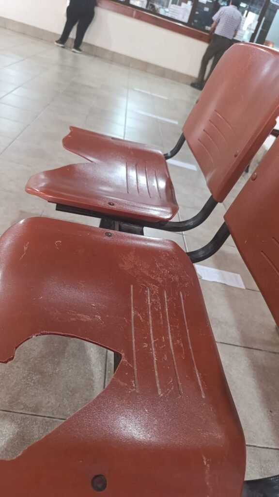 Un vecino que se acercó en la mañana de hoy a pagar sus impuestos en el Nuevo Centro Municipal ubicado en calle Güemes esquina Lamadrid nos envió la foto de esta noticia donde se puede ver el estado lamentable de las sillas donde los vecinos se sientan mientras esperan ser atendidos.